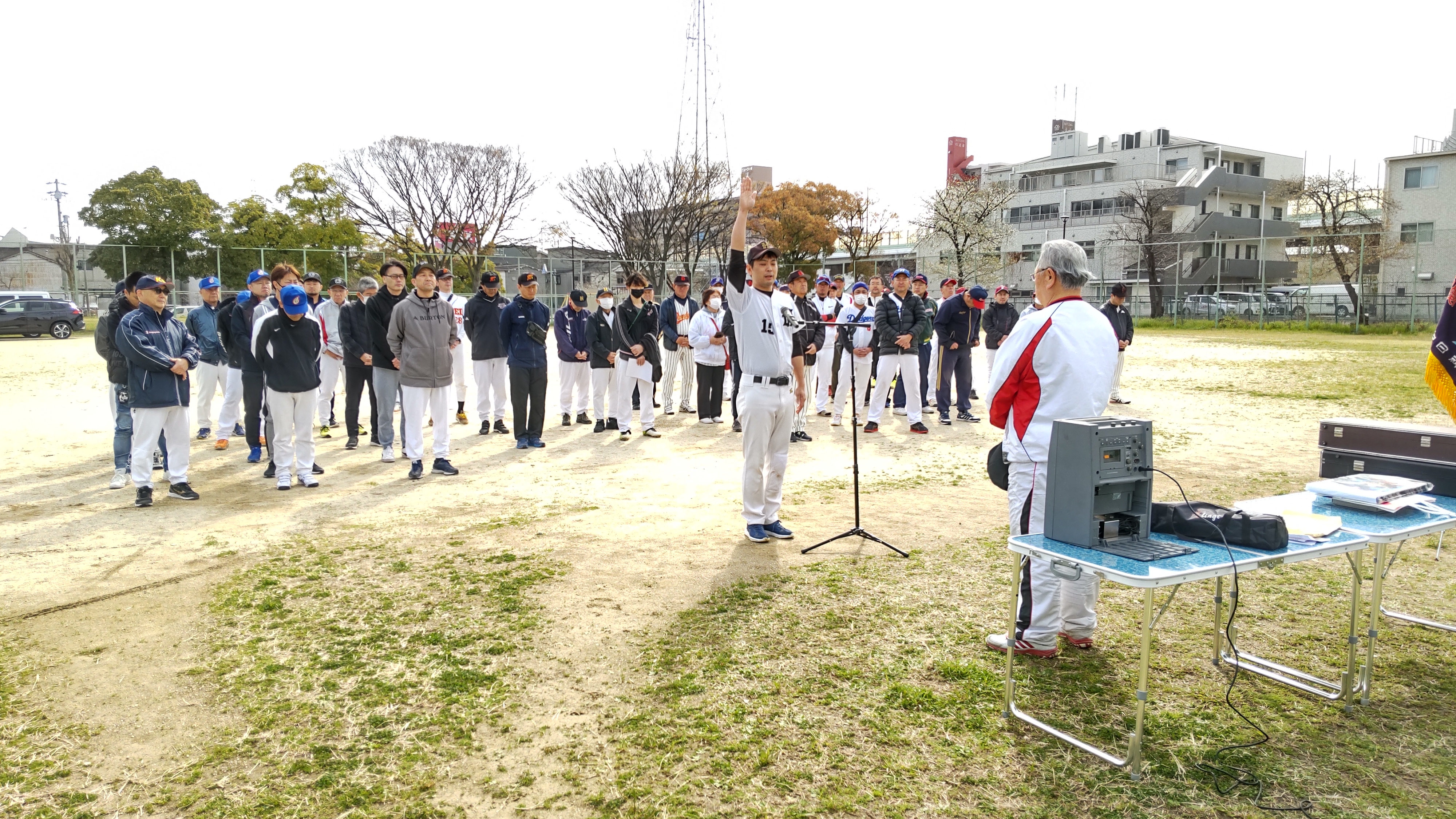 〇令和7年3月30日(日) 道徳学区ソフトボール連絡協議会主催のソフトボール大会の開会式が泉楽公園にて行われました。今年度は11チームで熱戦が繰り広げられます。