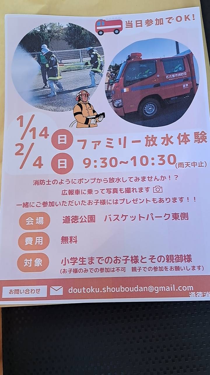 〇令和6年1月14日(日)道徳消防団の皆さんによるファミリー放水体験が道徳公園において行われました。次回は2月4日(日)に行われます。