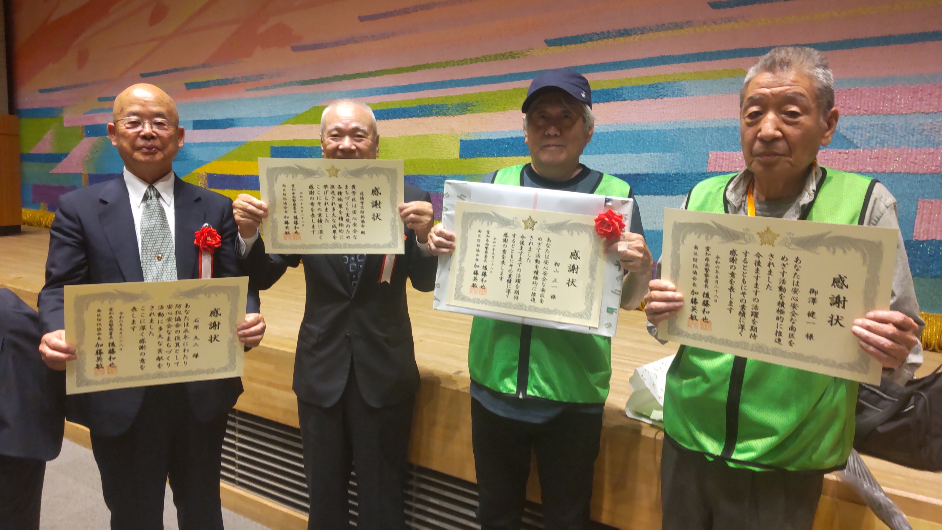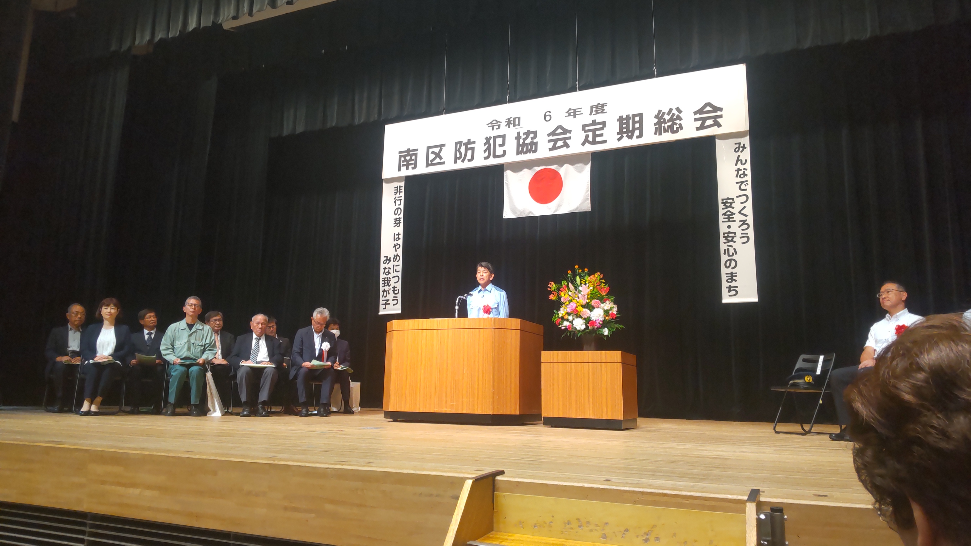 〇令和6年5月28日㈫南文化小劇場において令和6年度南区防犯協会定期総会が開催され、道徳学区から石原久三前会長、道徳学区防犯協会(東山芳徳会長)、学区防犯委員の御澤さん、籾山さんの3名・1団体が功労者・団体として表彰されました。おめでとうございます。